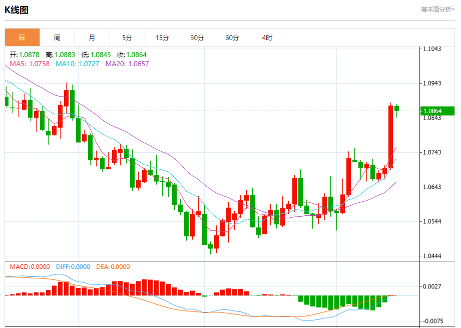 周三盘中,欧元/美元报1.0866,跌幅0.12%。