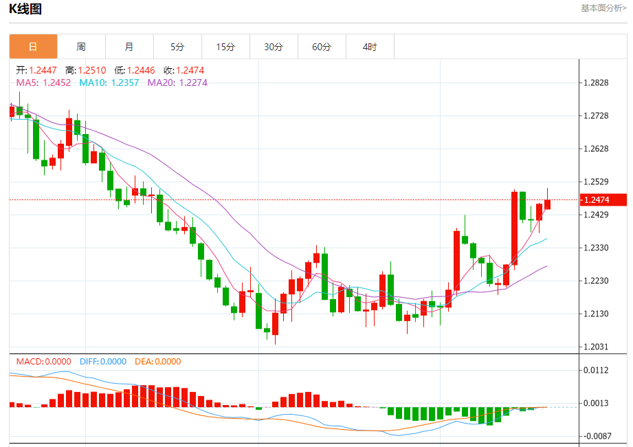 周一盘中,英镑/美元报1.2475,涨幅0.10%。