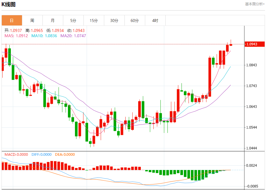 周二盘中,欧元/美元报1.0944,涨幅0.06%。