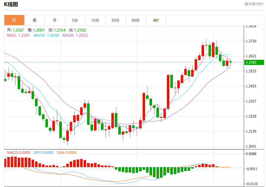 周五盘中,英镑/美元报1.2584,跌幅0.07%。