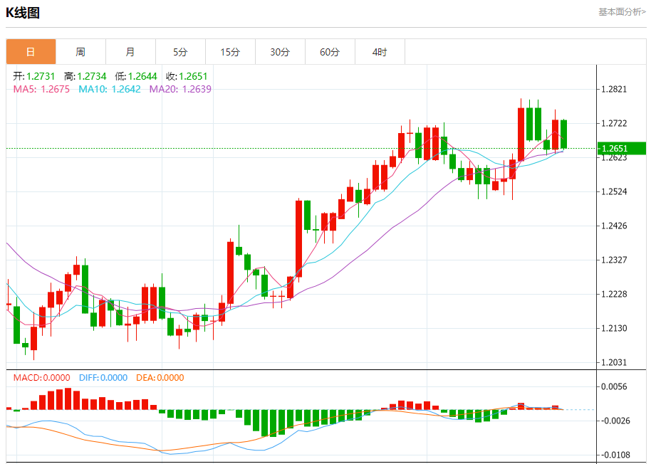 周三盘中,英镑/美元报1.2651,跌幅0.64%。