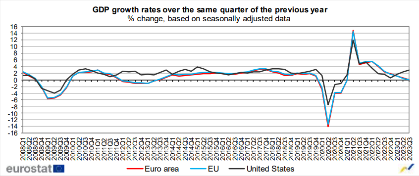 与上年同期相比,2023年第三季度,经季节性调整的欧元区和欧盟GDP均增长了0.1%,此前欧元区增长了0.5%,欧盟增长了0.4%。