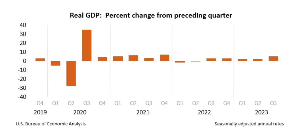 根据美国经济分析局(BEA)的数据,2023年第三季度,美国实际GDP以4.9%的年增长率增长。第二季度,实际国内生产总值增长2.1%。第三季度的增长主要反映了消费者支出和库存投资的增加。