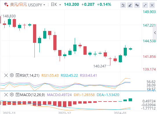 日线蜡烛图显示,美元/日元遇到了143.00上方200日均线的技术阻力,而且美元/日元从11月高点151.91起下跌7.5%自峰值到谷底的跌幅依然完整。