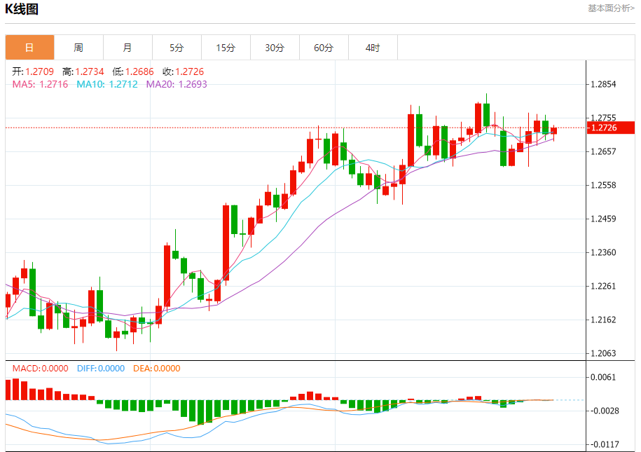 周三盘中,英镑/美元报1.2727,涨幅0.14%。