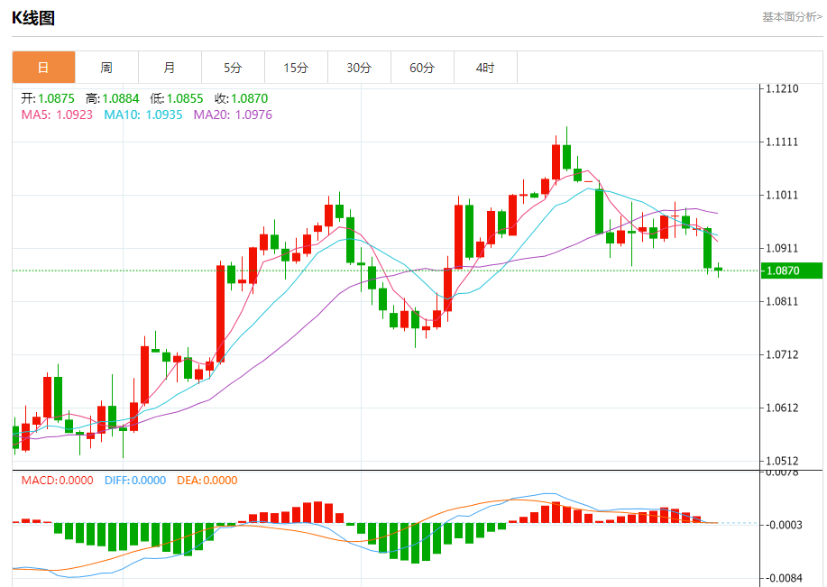 周三盘中,欧元/美元报1.0872,跌幅0.03%。
