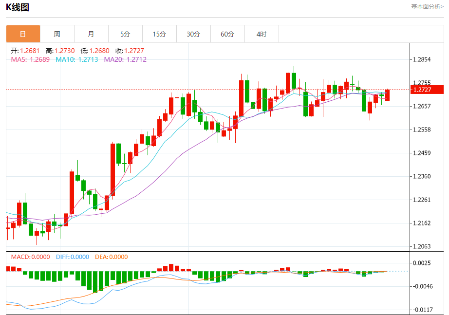 周一盘中,英镑/美元报1.2728,涨幅0.20%。