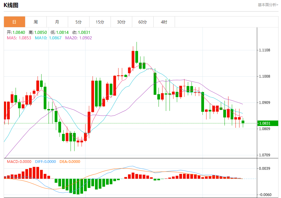 周一盘中,欧元/美元报1.0832,跌幅0.20%。