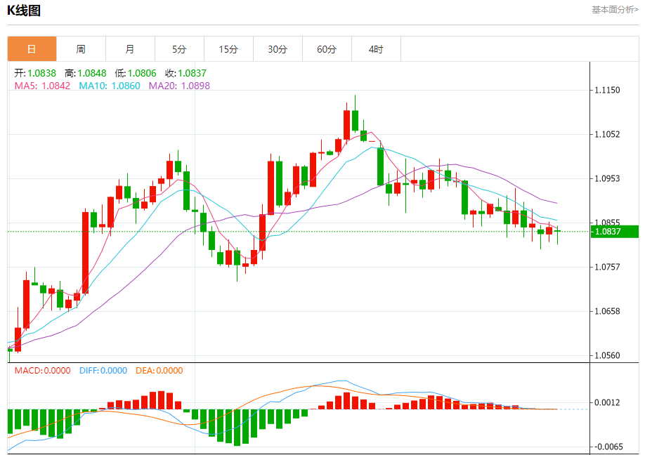 周三盘中,欧元/美元报1.0838,跌幅0.07%。