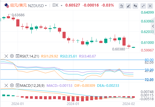 中国1月份服务业增速低于预期。财新周一公布的数据显示,中国服务业采购经理人指数连续13个月处于扩张区间。中国1月财新服务业采购经理人指数(PMI)为52.7,前值为52.9。房地产危机和中国经济复苏乏力可能会对中国代理的新西兰元(NZD)造成一些压力。