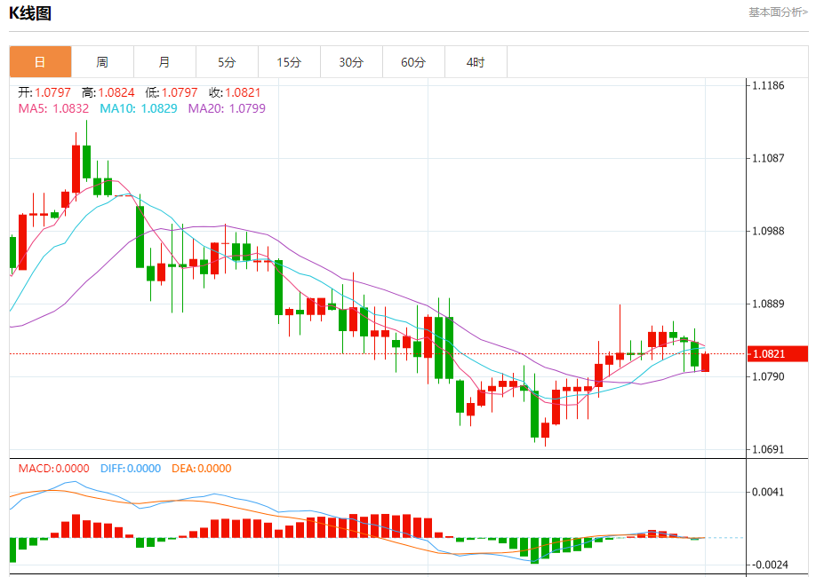 周五盘中,欧元/美元报1.0822,涨幅0.15%。