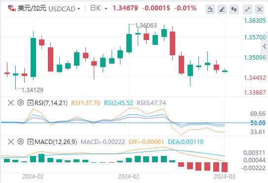 本周早些时候公布的美国通胀数据好于预期,这可能会使美联储(Fed)至少等到夏季才开始降息。总体通胀年率3.2%,高于1月份的3.1%,而核心通胀年率降至3.8%,低于前值3.9%。市场参与者将从美国2月份零售销售数据中获得更多线索,因为该数据可能会影响美联储在定于下周举行的3月份会议上的下一步行动。若该数据强劲可能会说服美联储关注更多数据,让决策者不必急于降息,这可能会提振美元(USD),为美元/加元货币对带来“顺风”。