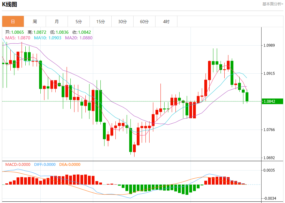周三盘中,欧元/美元报1.0843,跌幅0.21%。