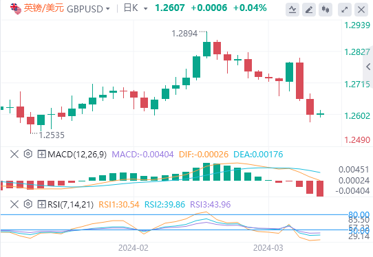 另一方面,市场再次押注美联储(Fed)将在6月份启动降息,这可能会限制英镑/美元的上行空间。美联储主席鲍威尔上周重申,鉴于经济持续增长,决策者计划在今年年底前降息。芝加哥商品交易所美联储观察工具显示,联邦基金期货已为美联储在6月会议上降息定价的几率为74.5%。