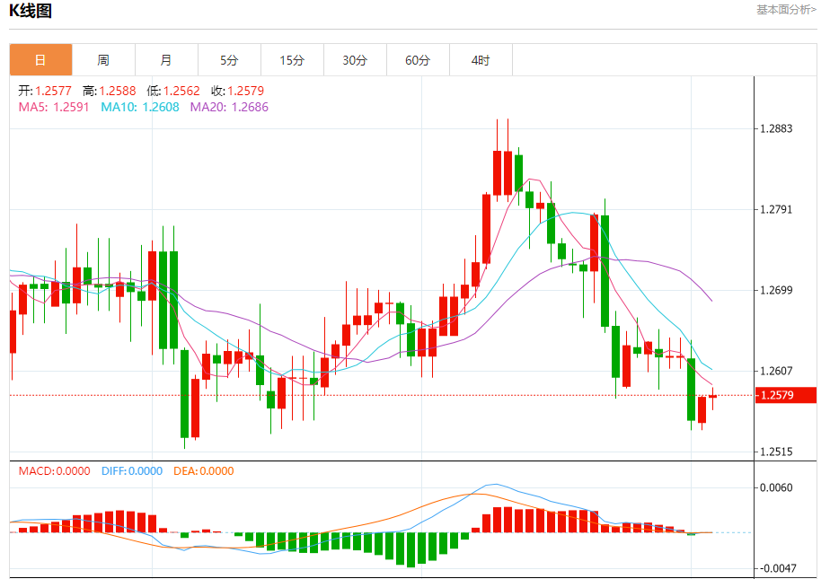 周三盘中,英镑/美元报1.2581,涨幅0.02%。