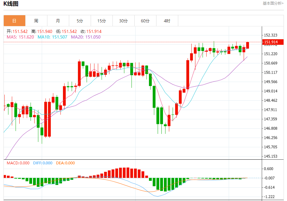 周一盘中,美元/日元报151.923,涨幅0.19%。