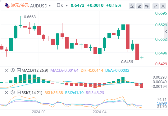 美国上周公布的数据几乎没有缓解市场对通胀依然坚挺的担忧,反而强化市场对美联储年内将推迟降息的预期。此外,一系列有影响力的美联储官员发表讲话迫使投资者将美联储启动降息的预期从6月份推迟到9月份。这一前景使得美国国债收益率持续走高,接近上周触及的年内峰值,再加上地缘政治紧张局势持续,应会支撑避险货币美元。因此,在确认澳元/美元货币对在短期内触底之前,也需要谨慎行事。