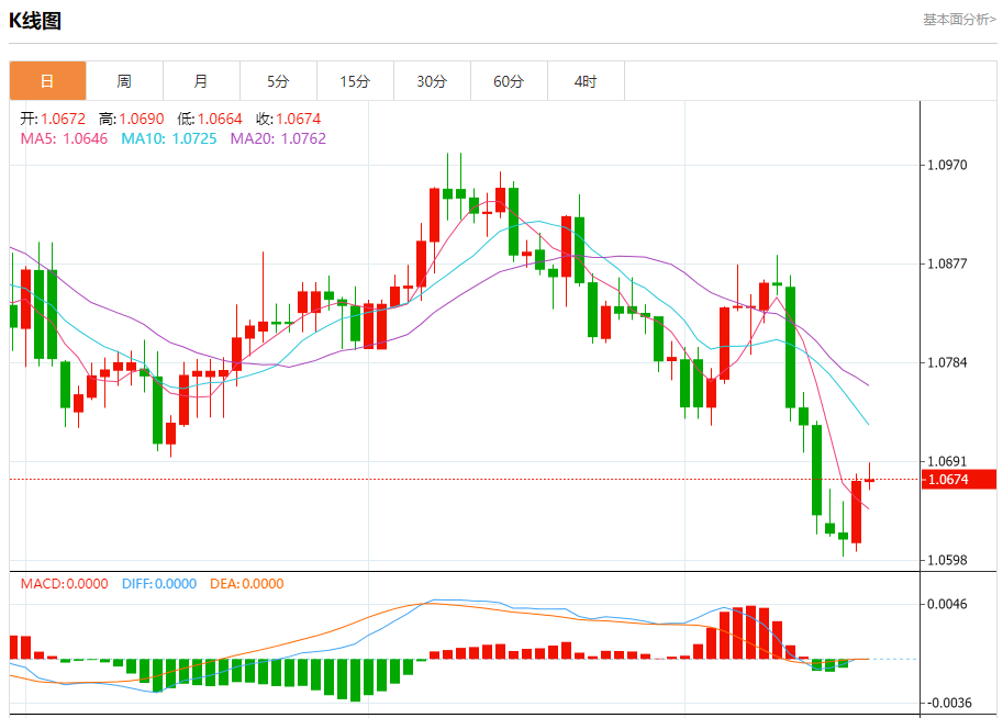 周四盘中,欧元/美元报1.0675,涨幅0.02%。