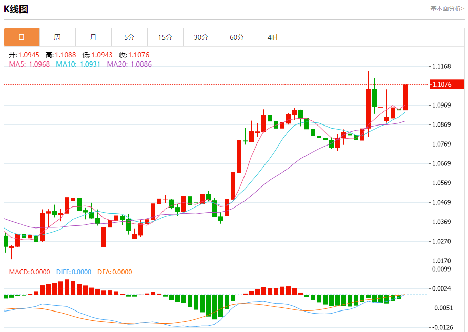 周四盘中,欧元/美元报1.1068,涨幅1.12%。