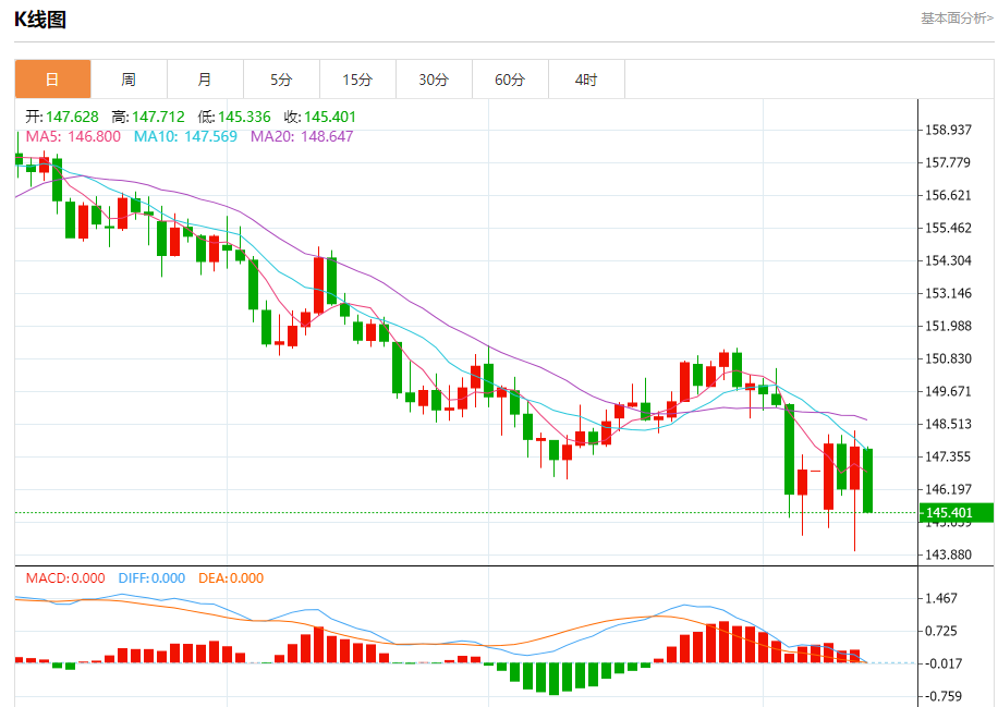 周四盘中,美元/日元报145.509,跌幅1.49%。