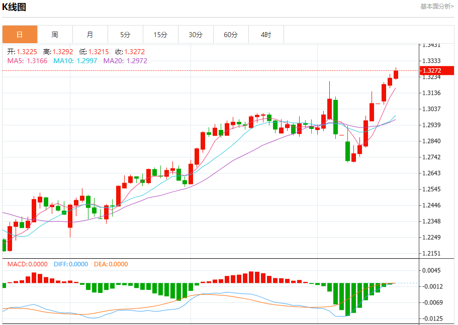 周三盘中,英镑/美元报1.3273,涨幅0.33%。