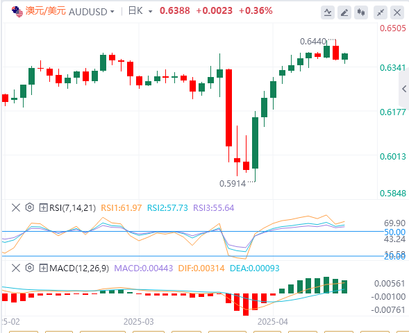 在上行方面,近期四个月高点0.6439是即时阻力,达到该水平是在4月22日。若突破该水平,可能为向五个月高点0.6515的反弹铺平道路。