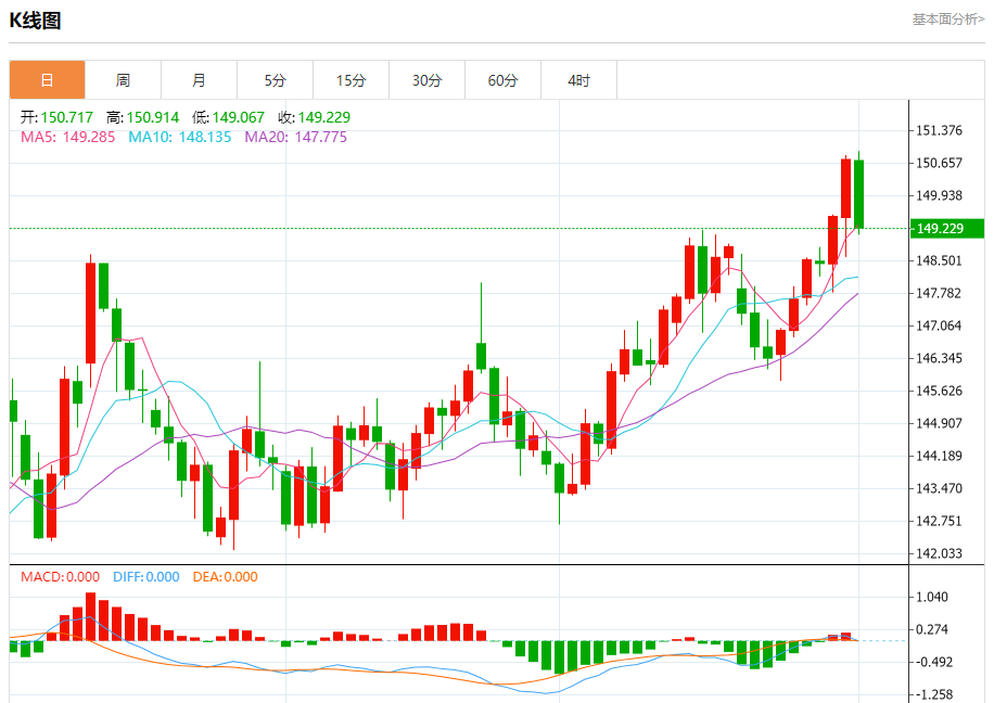 周五盘中,美元/日元报148.666,跌幅1.37%。