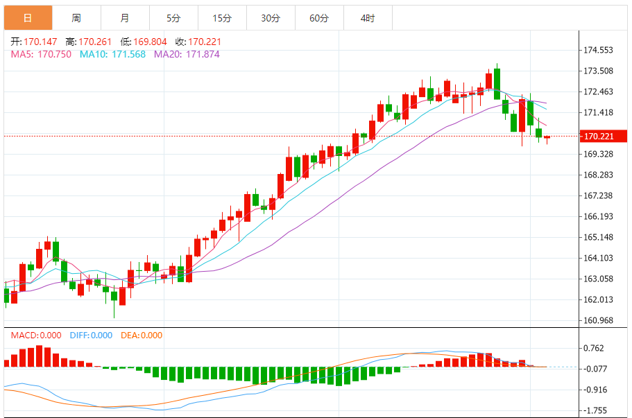 负面压力的持续将迫使其遭受更多损失,预计在169.35水平形成初始负面目标,达到168.45。