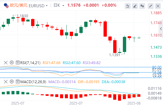 相对强弱指数(RSI)指标在50以上略微横盘,欧元/美元继续在20期和50期简单移动平均线(SMA)附近波动,反映出中立偏向。
