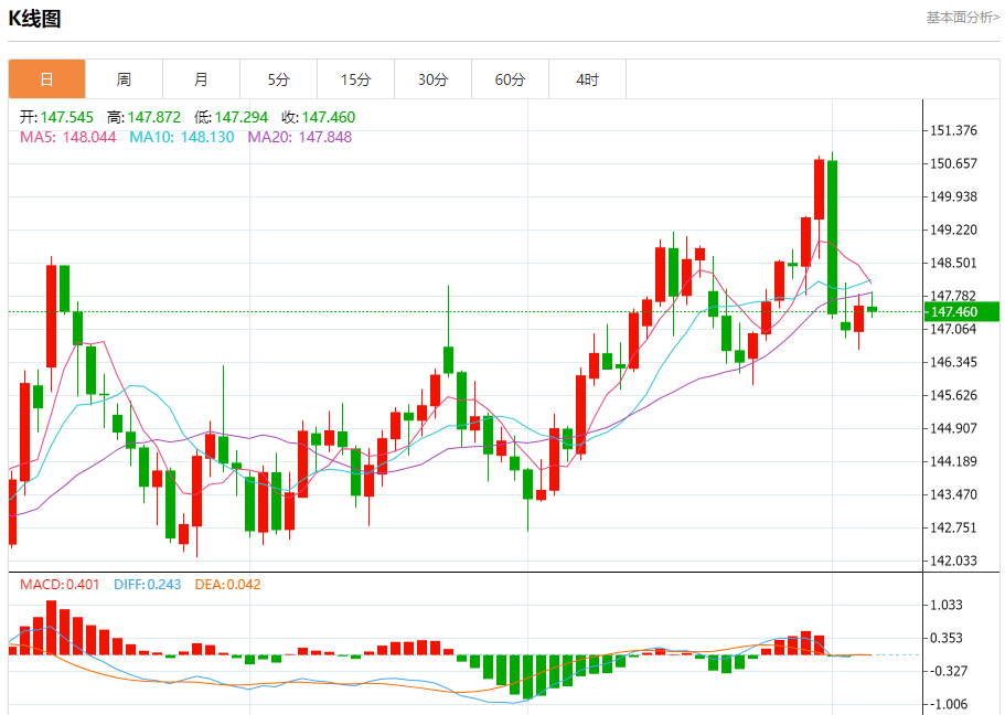 周三盘中,美元/日元报147.556,跌幅0.03%。