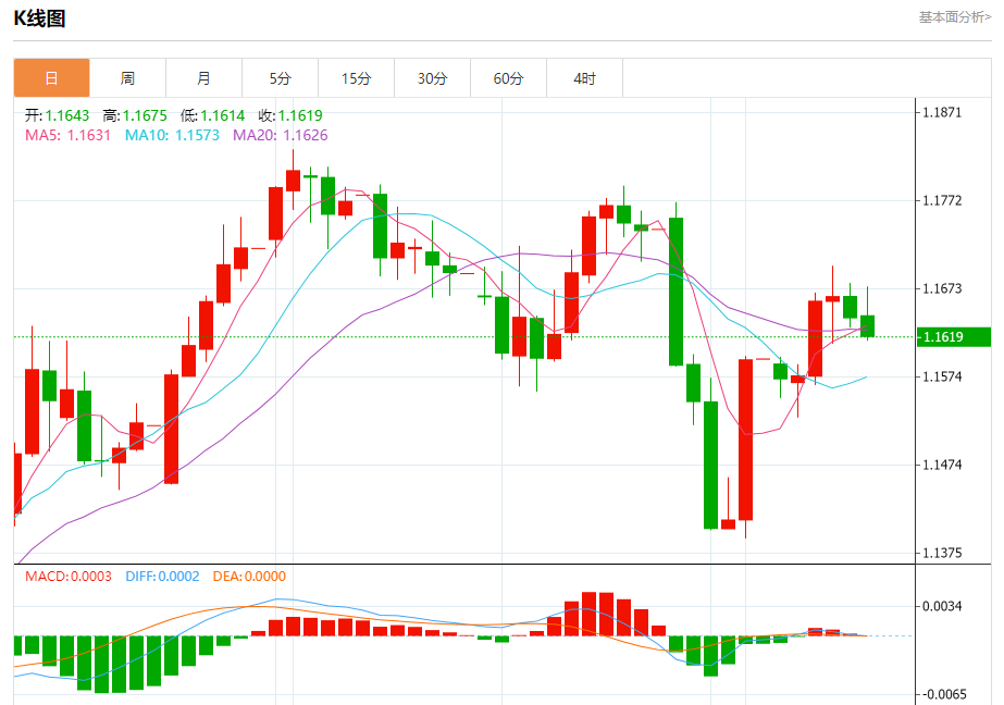 周一盘中,欧元/美元报1.1620,跌幅0.17%。