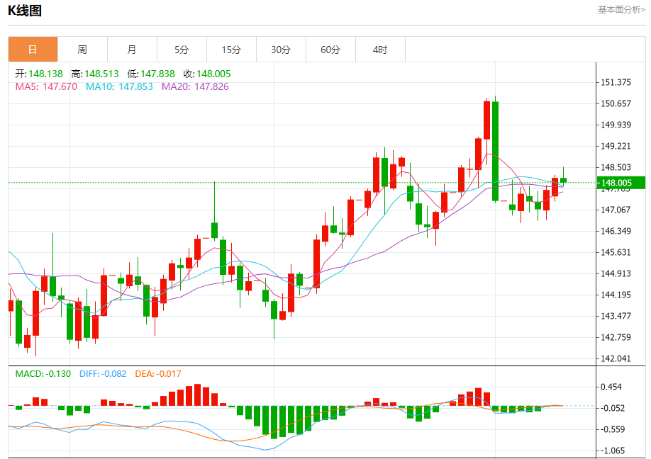 周二盘中,美元/日元报148.018,跌幅0.11%。