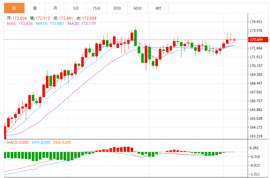技术上,在日线图中,欧元兑日元汇率近期呈现出稳步上扬的趋势,价格成功站稳在关键均线之上,均线系统逐渐形成多头排列格局,这预示着短期上涨动能较为充足。同时,MACD指标在零轴上方呈现金叉状态,且红柱持续增长,进一步验证了多头力量在市场中占据上风。相对强弱指标(RSI)处于60上方的强势区域,表明欧元兑日元在当前市场环境下处于强势上涨区间。