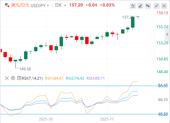 下调联邦基金利率的决定意见分歧,一位成员支持大幅降息50个基点(bps),另一位则倾向于维持利率不变。会议纪要发布后,12月降息的预期有所下降,芝加哥商品交易所FedWatch工具显示降息概率仅为30%。这反过来为美元兑日元提供了一定支持。