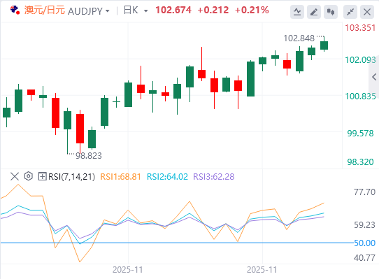 日线图中,澳元兑日元报102.79。价格稳位于20日均线101.41上方,远高于100日均线98.75。两家平均线均上升,确认了坚定的多头倾向。布林带趋势上升,现状盘旋于上方包线附近,表明买方压力持续且状况受限。RSI(14)显示65.02,看涨但未超买。