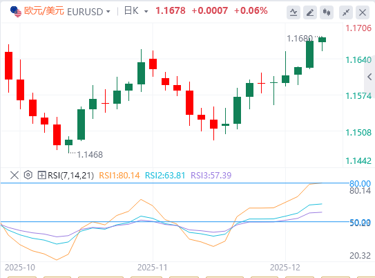 欧元/美元多头在经历八天反弹后,在1.1670附近遇到阻力。4小时相对强弱指数(RSI)正从超买水平回落,而移动平均收敛背离(MACD)指标仍位于零上,显示出温和的正向动能。
