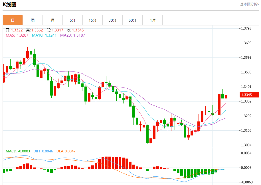 技术点评:RSI技术指标小于中性区域50。 MACD技术指标处在其信号线之下看多。 MACD必须突破其零线,才能预期出现进一步下行。 此外,价位低于其20天及50天移动平均线 ( 分别位于1.3352 和1.3346 )。