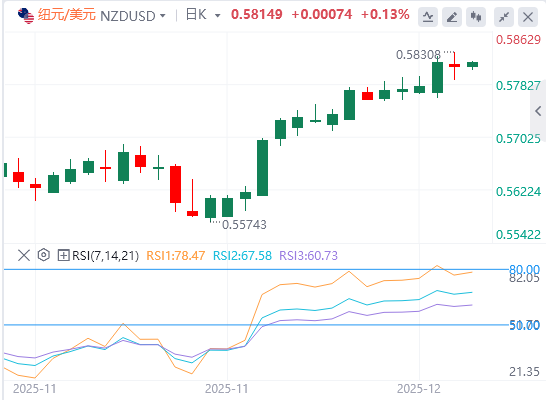 新西兰储备银行(RBNZ)在11月会议上将官方现金利率(OCR)下调25个基点(bps),至2.25%。新西兰央行表示,未来的利率变动将取决于经济和通胀前景,分析师认为降息周期目前可能已经结束。这反过来可能为新西兰兑美元提供一定支撑。