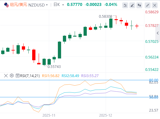 纽元/美元在0.5775附近下跌0.15%。20日指数移动平均线(EMA)上涨,位于0.5753,支撑了多头偏向。