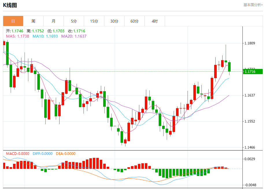 周三盘中,欧元/美元报1.1716,跌幅0.27%。