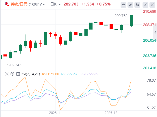 英镑/日元可能进一步触及210.00附近的新高。若突破该心理水平,可能将上涨趋势延伸至约213.10的上升通道上界。短期动能保持坚实,上升平均线有助于遏制回调并保持上行偏向。
