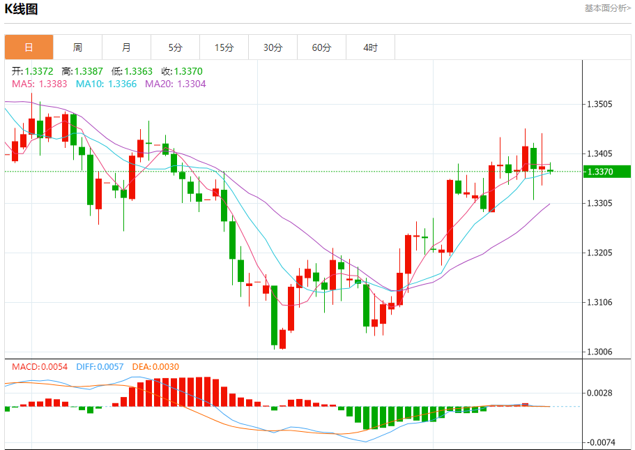 周五盘中,英镑/美元报1.3375,跌幅0.03%。