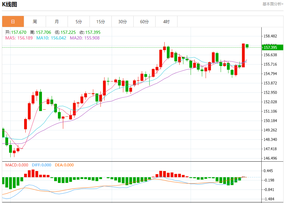 今日分析:看涨,当 157.22 为支撑位,目标定在158.44。