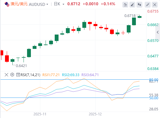 趋势依旧稳固,20周EMA持续上行,支撑位于EMA区间0.6561–0.6546。RSI尚未达到超买,留有在70之前延展的空间。若周收盘价高于0.6700,将为进一步上涨打开通往10月7日高点0.6810的大门。