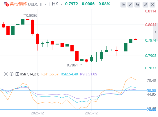 在瑞士法郎方面,在格林威治时间07:30公布12月消费者物价指数(CPI)数据之前,瑞士法郎(CHF)汇率整体表现平稳。市场预计瑞士通胀将有所加速,同比涨幅将从11月的0%升至0.1%。从月度数据来看,价格压力预计将再次回落,回落速度为0.1%,低于此前0.2%的水平。