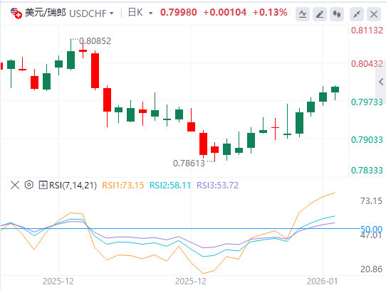 1月9日,周五欧市初盘,美元/瑞郎在连续三个交易日上涨后保持平静,徘徊在0.7990附近。随着地缘政治担忧持续,瑞士法郎(CHF)仍受避险需求支撑,货币对停止上涨。与此同时,瑞士10年期国债收益率上涨至接近0.30%。