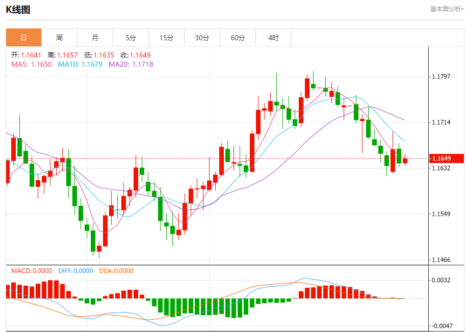 周三盘中,欧元/美元报1.1645,涨幅0.03%。
