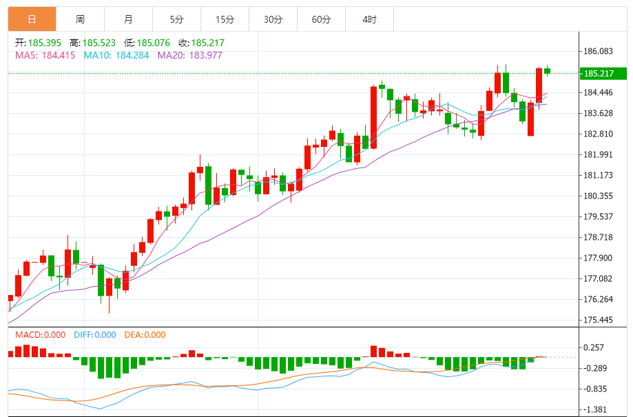 周三,欧元/日元下跌0.11%至185.224附近。