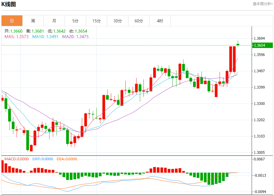 周一盘中,英镑/美元报1.3652,涨幅0.05%。