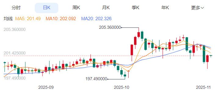周四,英镑/日元下跌0.04%至201.04附近。 英镑方面,英国三季度GD环比零增长虽引发衰退担忧,但10月服务业I意外回升至50.2(荣枯线上方),显示经济韧性超预期。尽管搜索中未获取2025年11月6日发布的英国10月零售销售数据,但市场此前担忧的“提前降息”预期已有所降温,当前定价英国央行2026年2月首次降息的概率